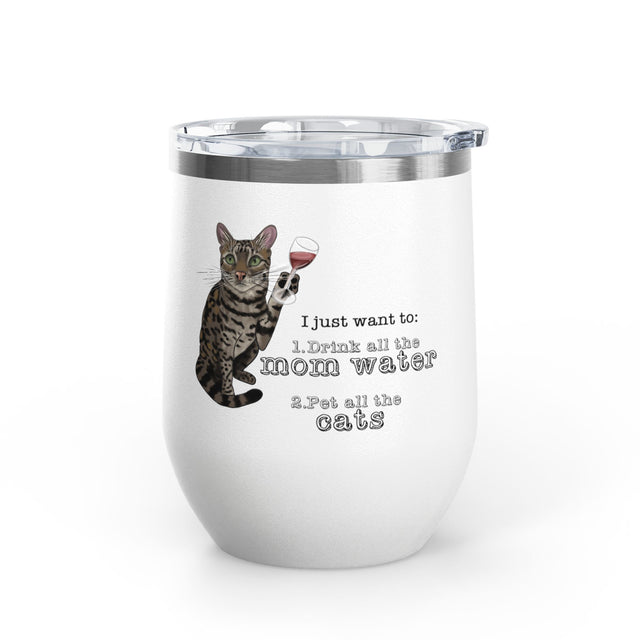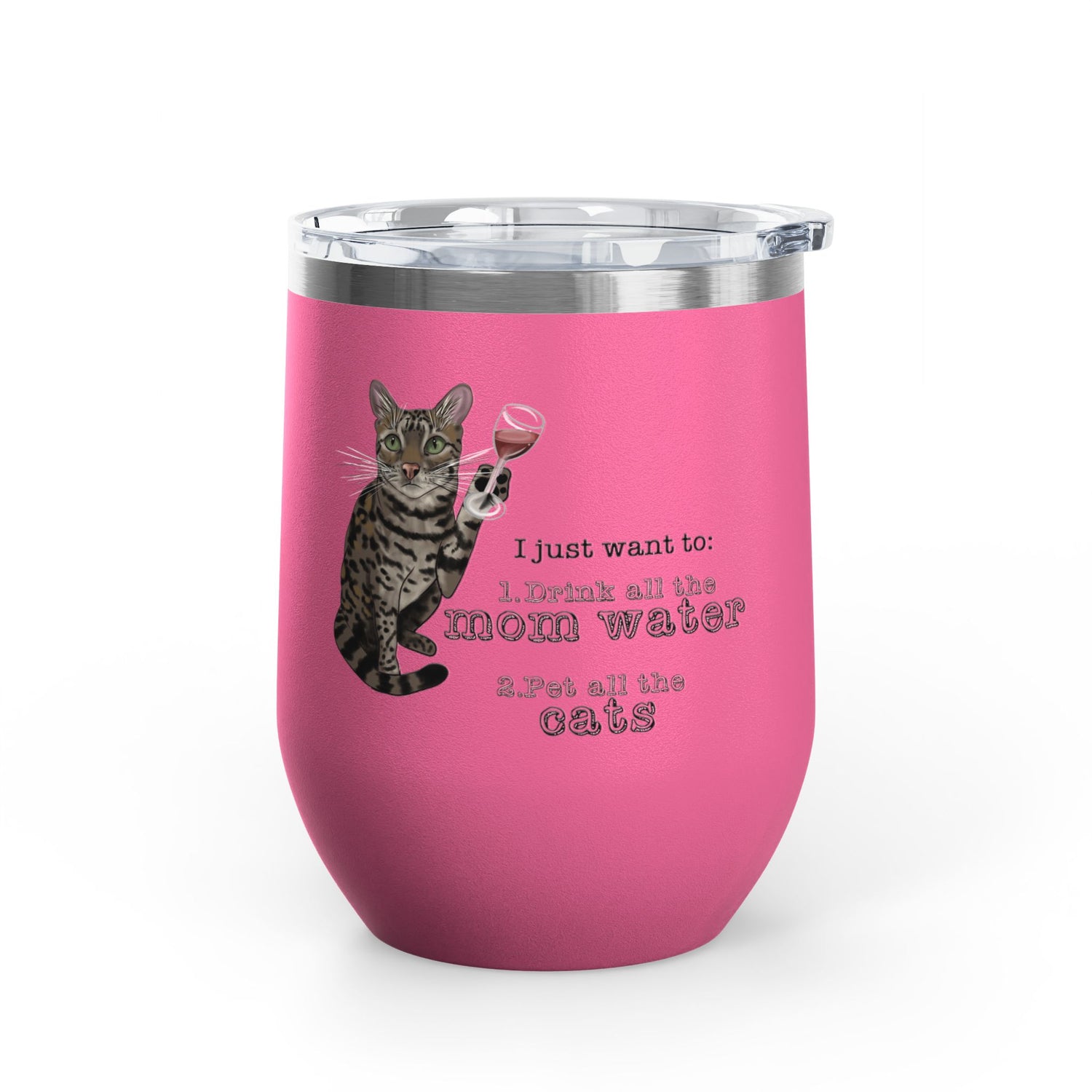 Sip in style with this Flounder the Talking Cat wine tumbler! Featuring Flounder holding a wine glass next to speech buttons saying "I just want to drink all the mom wa ter and pet all the cats," this whimsical 12oz tumbler adds fun and flair to your drinkware collection. Made from 100% stainless steel, this Polar Camel tumbler features double-wall vacuum insulation to keep your beverages at the perfect temperature. The power-coated finish ensures durability, while the included clear lid provides convenience and spill protection. Whether you're enjoying wine, water, or anything in between, this tumbler is a perfect gift for cat lovers with a sense of humor. Ideal for both hot and cold drinks, it’s a must-have for anyone who needs a little "mom water" in their life!